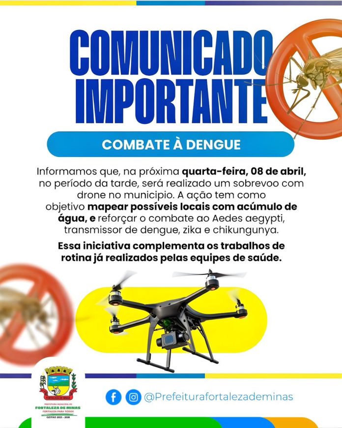 A Prefeitura de Fortaleza de Minas informa que, na próxima quarta-feira, 08 de abril, no período da tarde, será realizado um sobrevoo com drone no município.